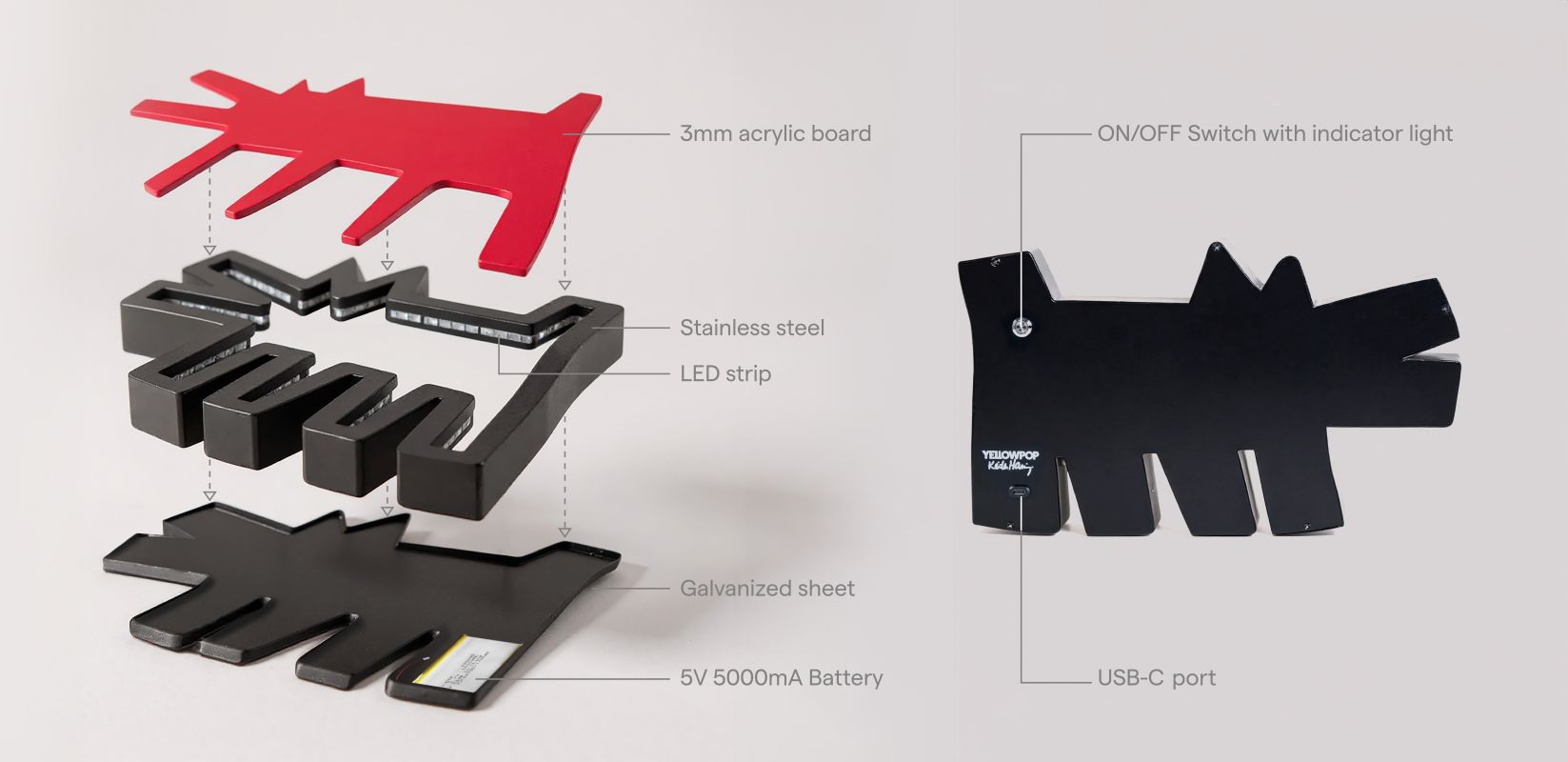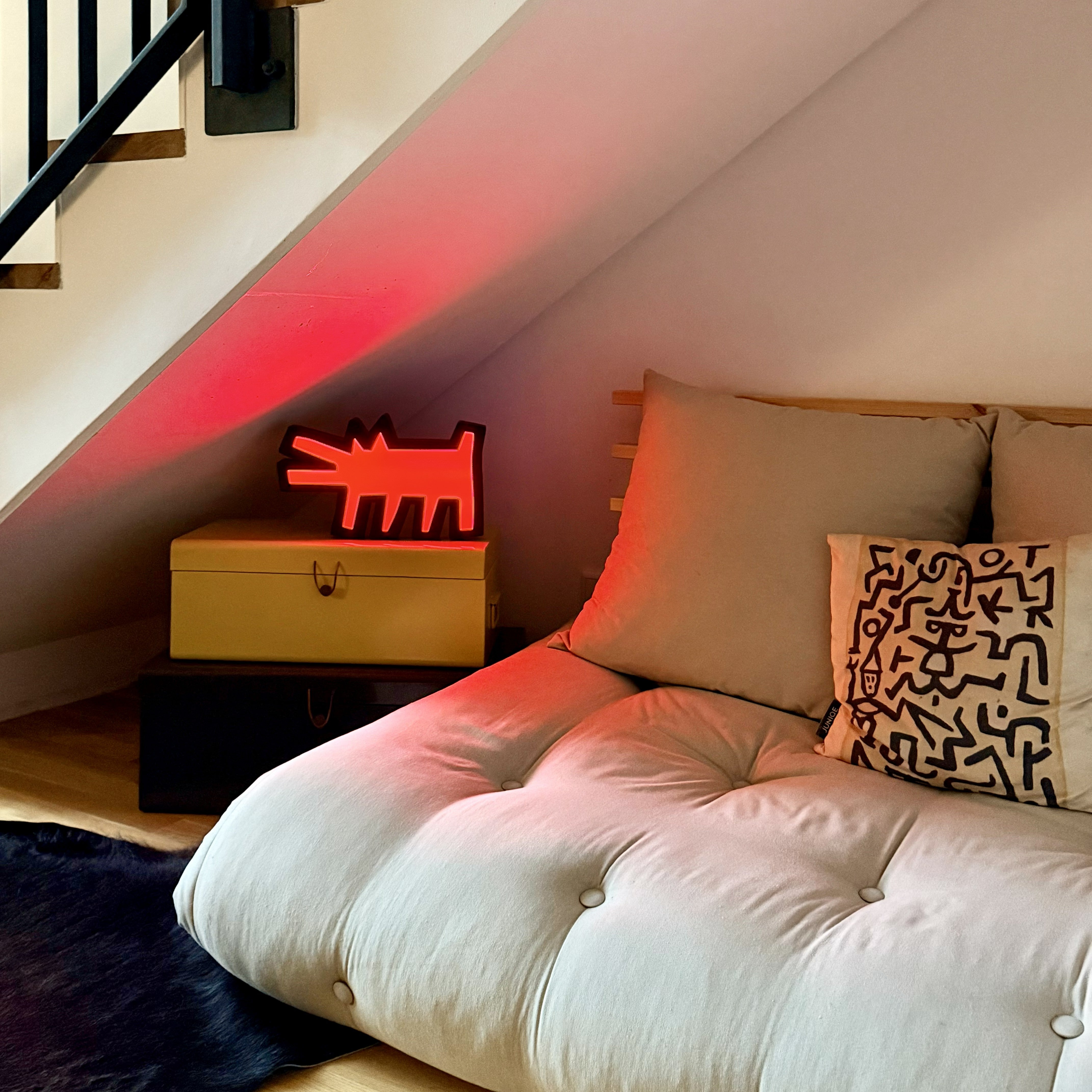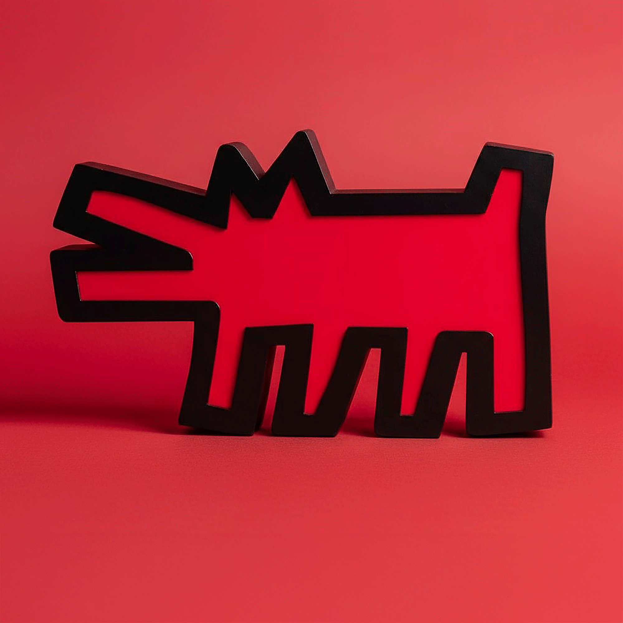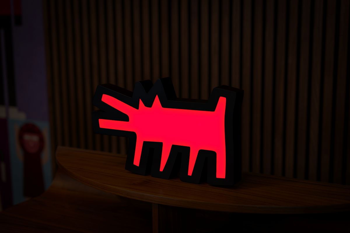 Keith Haring’s famous Barking Dog jumps off the canvas and into your space. This light masterpiece captures the vibrancy of his art and the rhythm of the streets, transforming your space into an animated gallery.