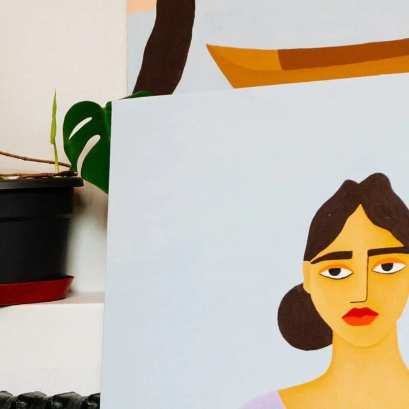 buy her neonLeaβs studio is a minimal, calming space with a few vintage pieces (she is a particular fan of the 70s). She spends most of her time in her studio and itβs become her home. Itβs the perfect backdrop to her bold and vibrant paintings using color blocking to depict a diverse range of females.