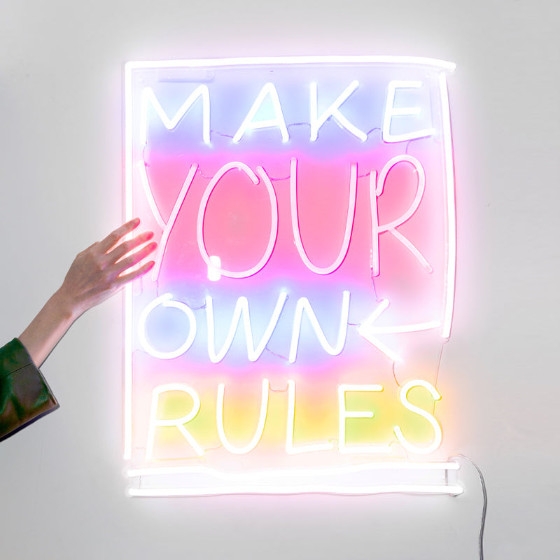 Each sign is made of a neon flex material, consisting of PVC or Silicon piping with LED lights, that is mounted on aΒ recycledΒ acrylic board. These materials allow us to create realistic neon signs, with bright lights and intense color, while being more durable, affordable, and sustainable than traditional neon.